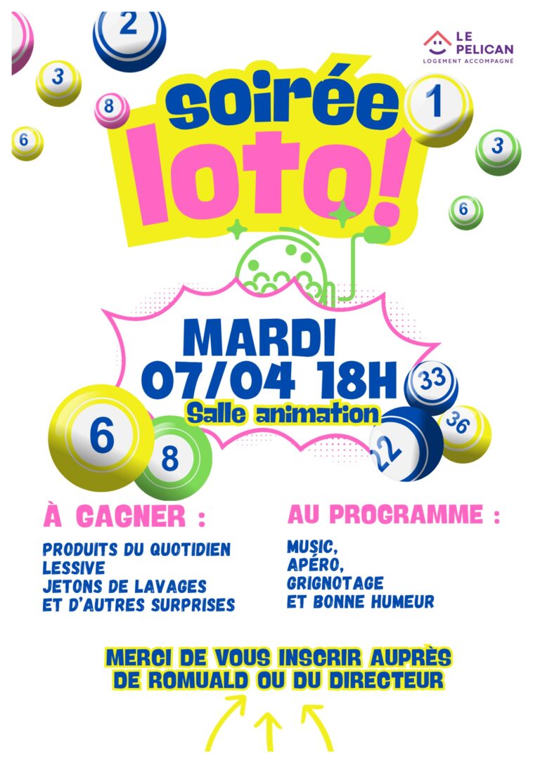 Envie de passer un bon moment dans une ambiance conviviale ? Rendez-vous le mardi 7 avril à partir de 18h dans la salle d’animation de l’établissement des Quatre Églises pour une soirée loto ouverte à tous !